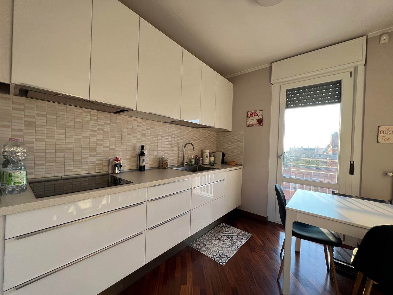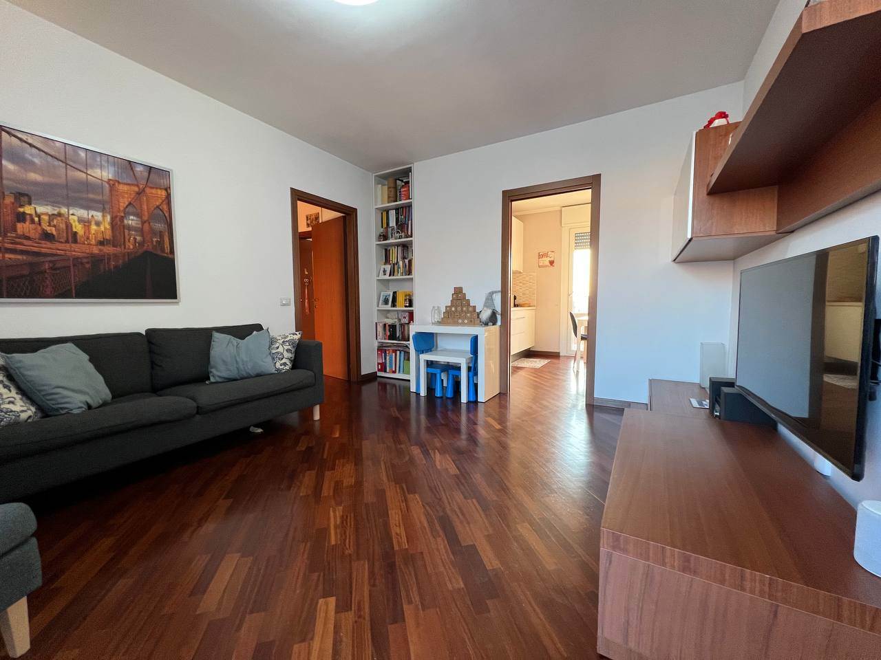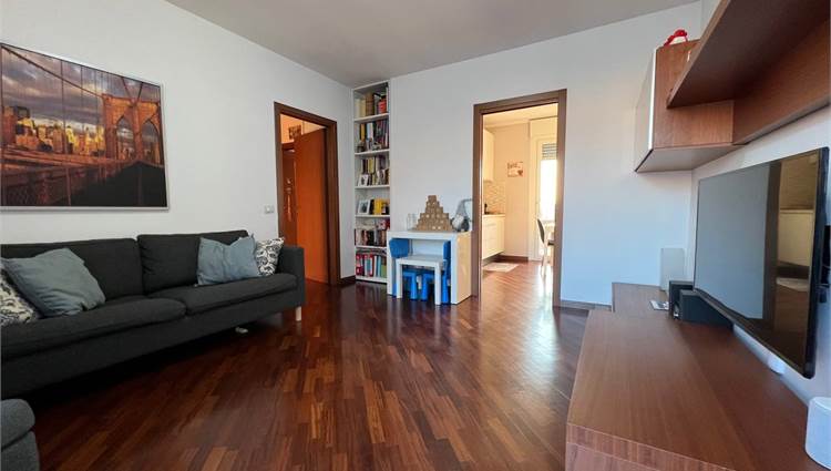 L'appartamento offre un'ampia zona giorno con cucina a vista, due camere da letto spaziose e due bagni completi.